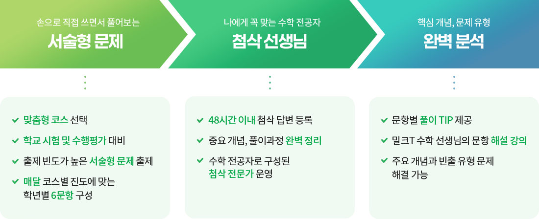 손으로 직접 쓰면서 풀어보는 서술형 문제: 맞춤형 코스 선택, 학교 시험 및 수행평가 대비, 출제 빈도가 높은 서술형 문제 출제, 매달 코스별 진도에 맞는 학년별 6문항 구성 나에게 꼭 맞는 수학 전공자 첨삭 선생님: 48시간 이내 첨삭 답변 등록, 중요 개념, 풀이과정 완벽 정리, 수학 전공자로 구성된 첨삭 전문가 운영 핵심 개념, 문제 유형 완벽 분석: 문학별 풀이 tip 제공, 밀크T 수학 선생님의 문항 해설 강의, 주요 개념과 빈출 유형 문제 해결 가능